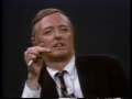 In this sizzling exchange, WFB tries to get his guest to admit that he is advocating illegal activities, and Mr. Kunstler tries to get Mr. Buckley to admit that our activities in Vietnam are at least as illegal. WFB: "Can I proceed on the assumption that you can distinguish between a declaration of war passed by both Houses of Congress pursuant to an attempt to save the world from the Axis powers; to defend the Jewish population of Germany, to the extent that it could be done; to save people from the Axis aggressions against China-can you distinguish between that and somebody burning down a building in protest against social policies that call for building a gymnasium in that university? Is that a distinction?" WK: "You usually don't help me so much. You've given me my answer. Because what you've really said is that under certain circumstances any form of arson, mayhem, bombing is justifiable, and you've given an example of World War II. I'm telling you, there are many people in the United States who believe that it's just as justifiable to try to stop the war in Vietnam as it is to prosecute World War II to stop the Germans from doing the same thing we're doing."